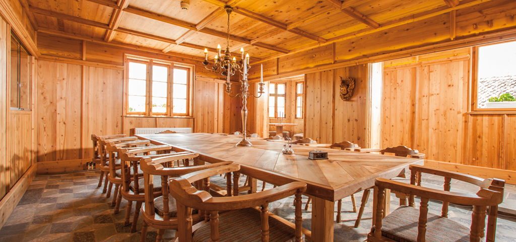 Im Rittersaal speist man an einer langen Tafel aus steirischem Nussholz, welche bis zu 15 Personen Platz bietet. Die Altholzvertäfelung samt Holzdecke, Steinwabenboden und den historischen Bleiglasfenstern mit Porträtmalerei ist einzigartig.